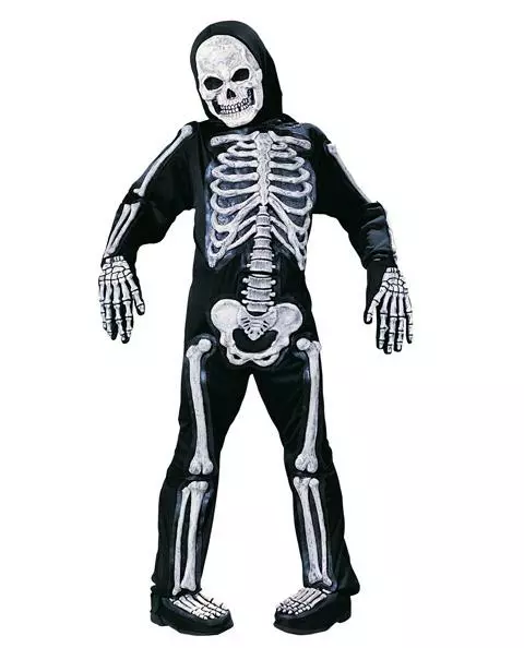 One Scary Skeleton!Costume Includes: Jumpsuit with skelton on outside of suit, sculpted gloves, shoe tops and hooded skull mask. Available sizes: